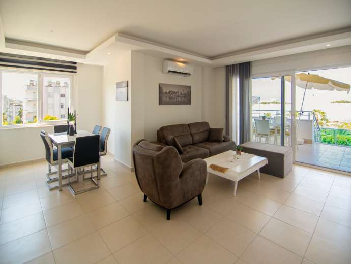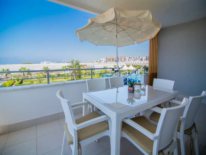 Lägenhet på första våningen med utsikt mot poolområdet. Ingången är från markplan men lägenheten är placerad ovanför det gemensamma cafeet. Bostaden har ett vardagsrum med öppen kökslösning. Balkong rätt utanför vardagsrummet är på hela 21m2. Perfekt plats för balkongmöbler. Uteplatsen fortsätter med en stor terass på ytterligare 32m2. Här njuts det av solen hela dagen. Bra med plats för både solsängar och parasoller.